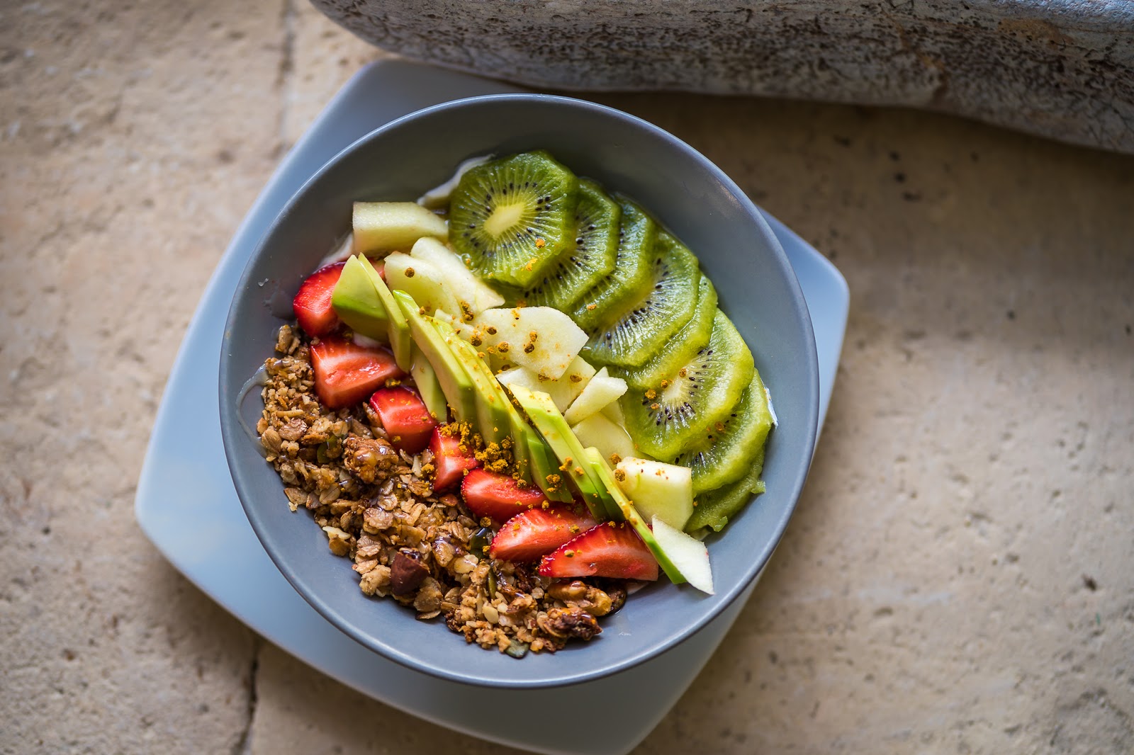 希臘優格搭配自製蜂蜜堅果麥麥脆片,時令新鮮水果,花粉,酪梨和蜂蜜