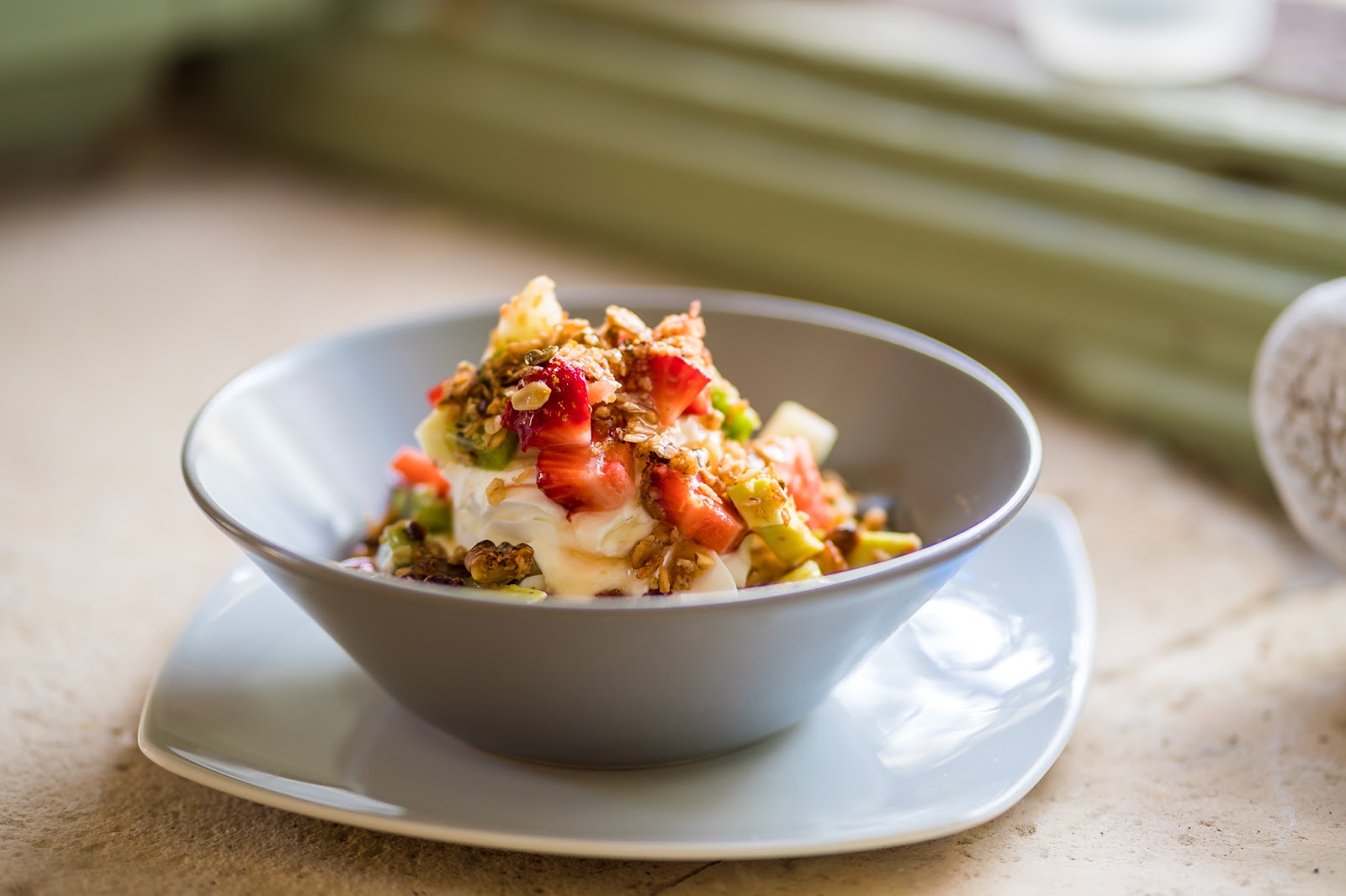 Homemade Granola, Greek yogurt with seasonal fresh fruits,