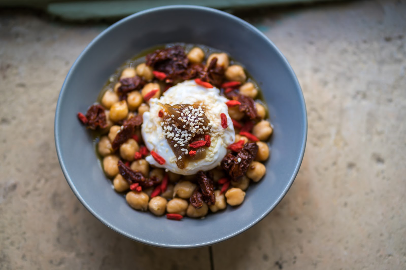 Slow cooked chickpea stew with poached egg, goji berry, fresh