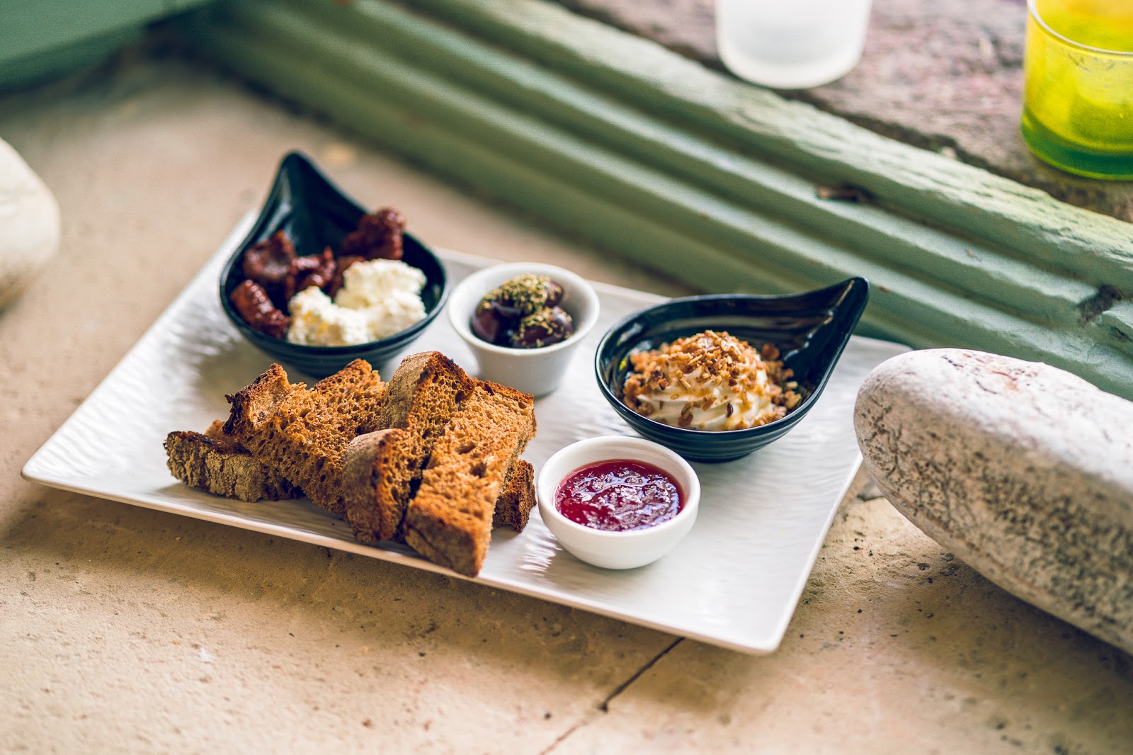 新鮮全麥麵包與希臘 anthotyro 白起士,醃製西洋梨,烤焦糖核桃,