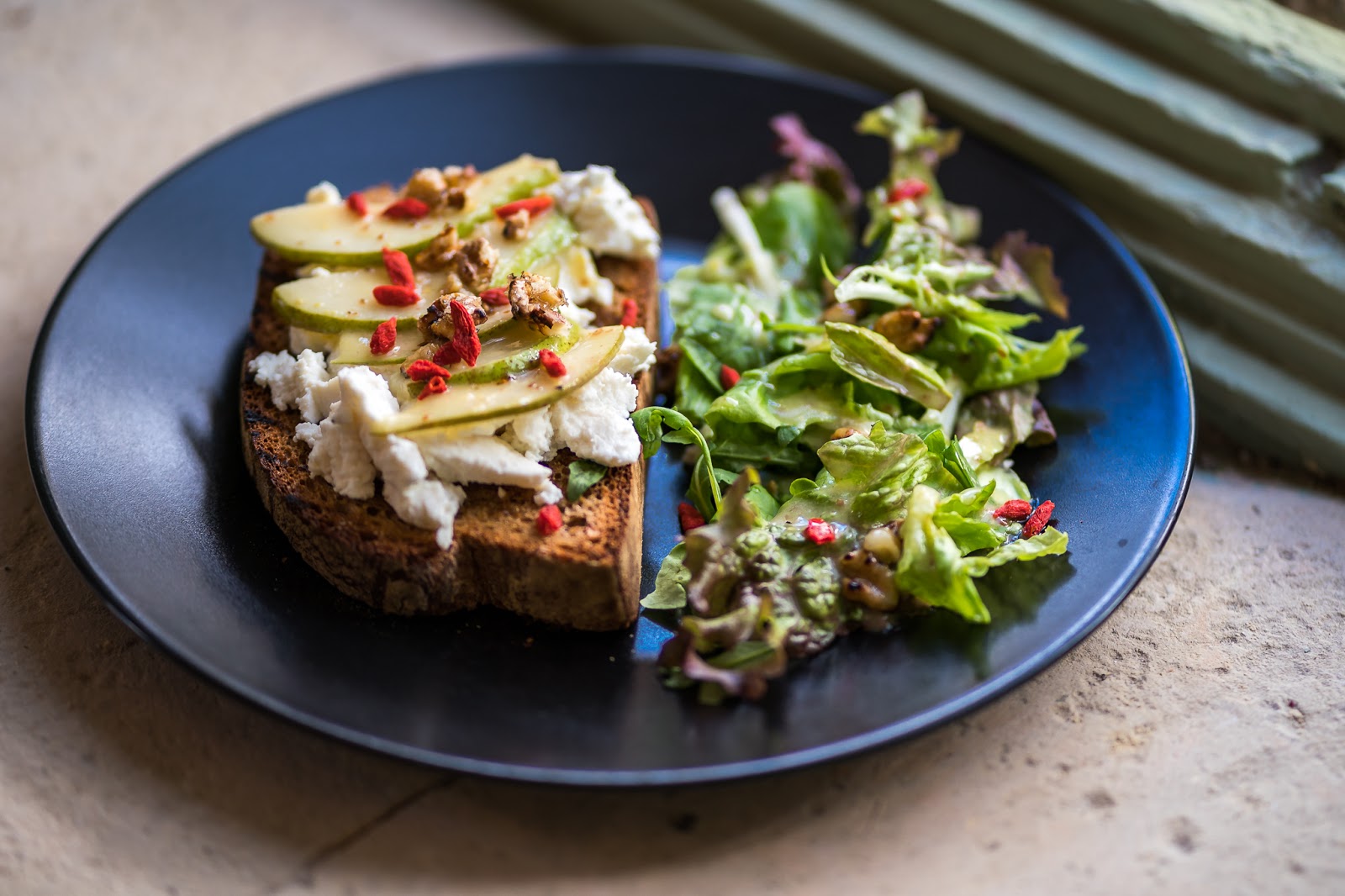 Fresh made whole wheat bread with Greek fresh anthotyro cheese, fresh pear slices, caramelized walnuts, goji berry, bee pollen with side green salad and honey mustard sauce on the top.