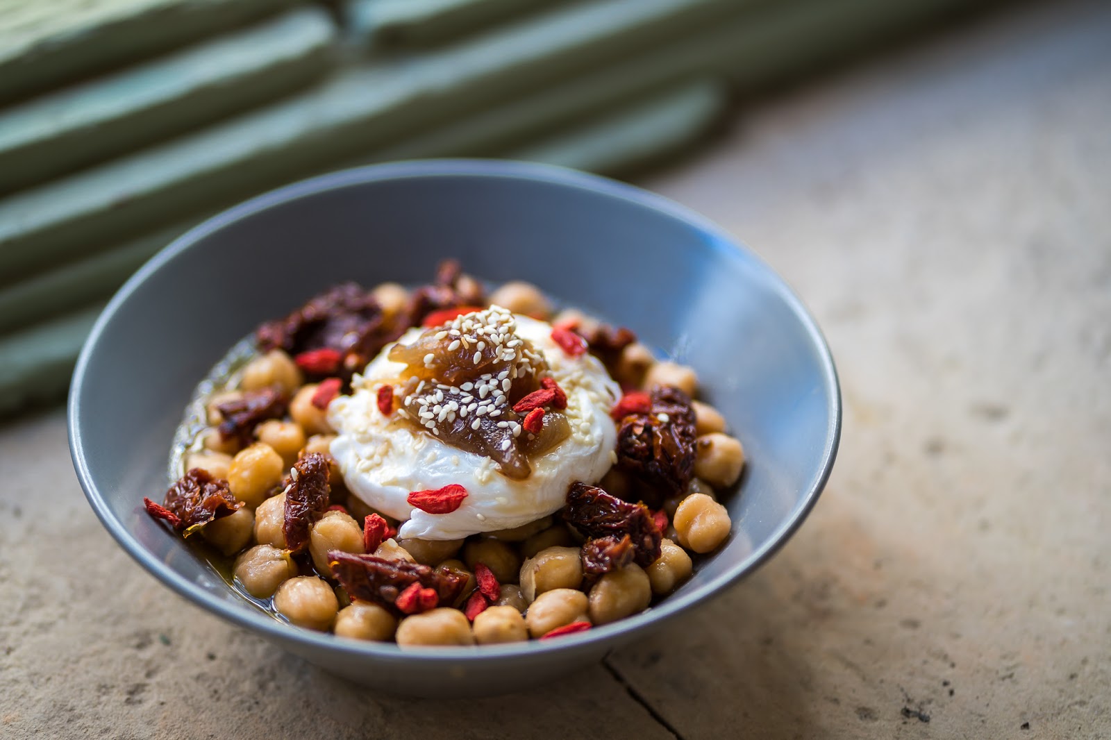慢燉鷹嘴豆,水波蛋,枸杞,新鮮歐芹香料,焦糖洋蔥和黑芝麻。