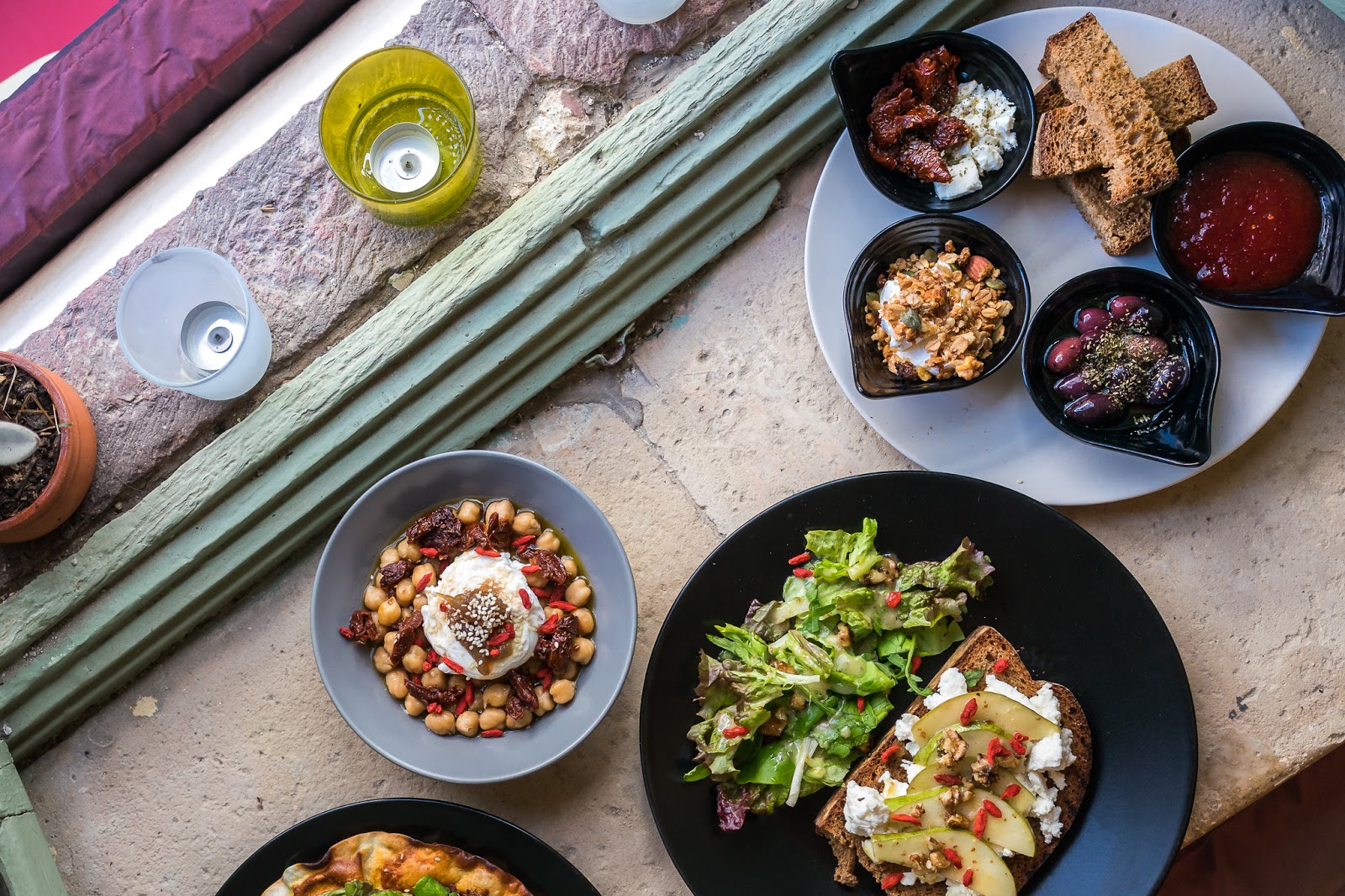 Grill whole wheat bread with Greek feta cheese, Greek sun dry tomatoes, Greek olives & olive oil, traditional cherry tomato jam and Homemade Granola with Greek yogurt.