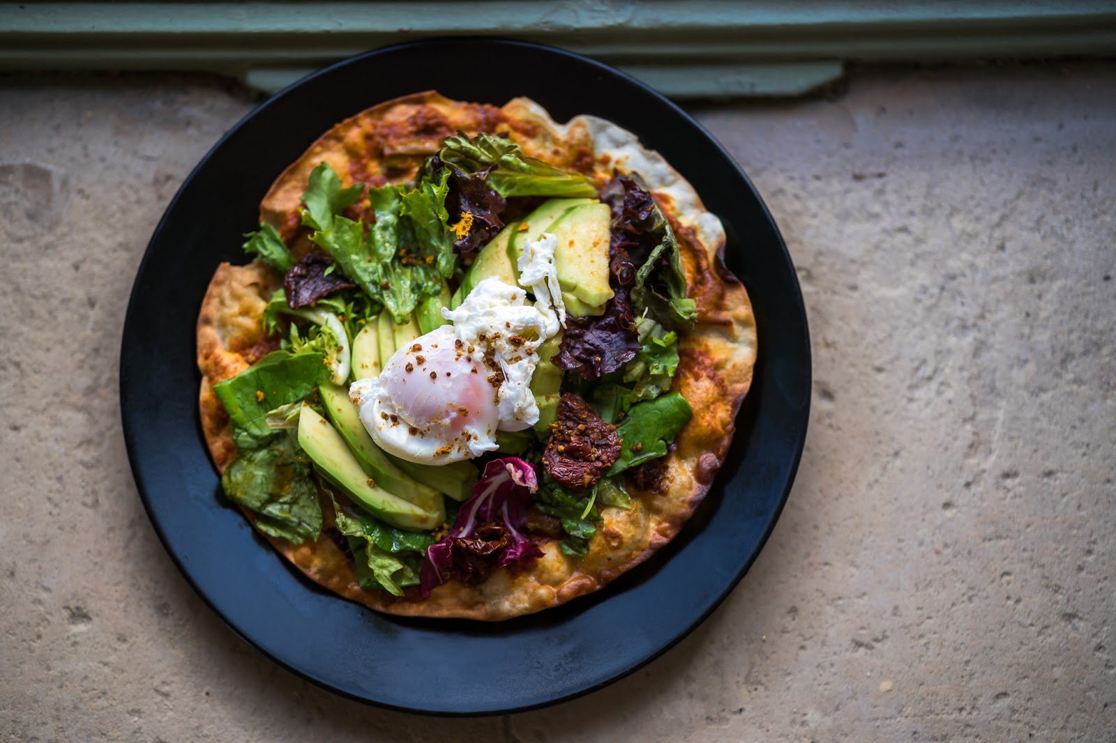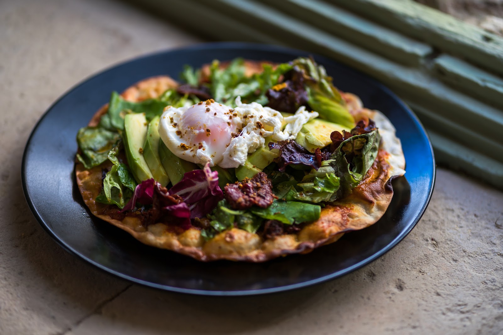 Traditional pita bread with Bio Puccini tomato sauce, green salad, avocado, poached egg, goji berry and sesame on the top.